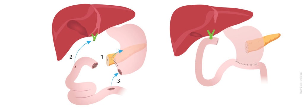 Il s’agit de l’intervention nécessaire en cas de tumeur de la tête du pancréas. Elle est en général réalisée par abord mini-invasif (cœlioscopie 3D ou robot) mais il peut être nécessaire de réaliser une cicatrice (laparotomie) si la tumeur est au contact de l’artère ou de la veine.