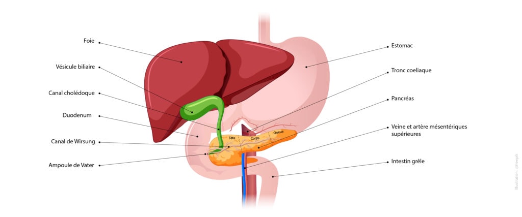 Le pancréas est un organe situé dans l’abdomen, derrière l’estomac et accolée au duodénum. Il s’agit d’une glande comportant 3 parties : la tête, le corps et la queue.