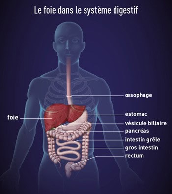 Le foie est un organe situé dans la partie supérieure droite de l’abdomen, sous les côtes. C’est l’organe le plus volumineux du corps, il fait partie de l’appareil digestif. Il remplit de nombreuses fonctions vitales indispensables (production de la bile, stockage des minéraux / vitamines/ glucose, filtre des éléments nocifs, fabrique des facteurs de coagulation, régule le cholestérol…)