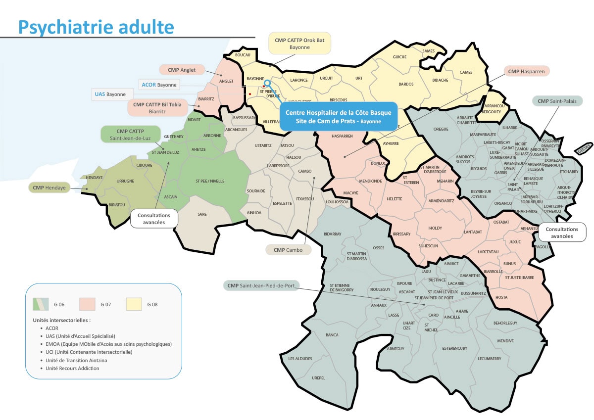 Il accueille des patients de 3 secteurs de Psychiatrie Adulte en intra et extra hospitalier couvrant l’ensemble du Pays Basque